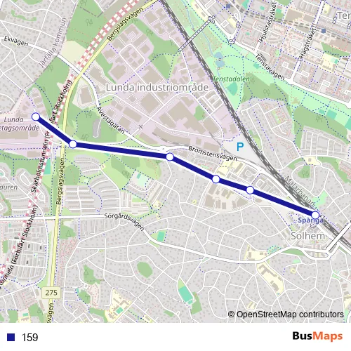 The first stop of the 159 bus route is Spånga station and the last stop is Godsterminalen. 159 is operational during everyday.