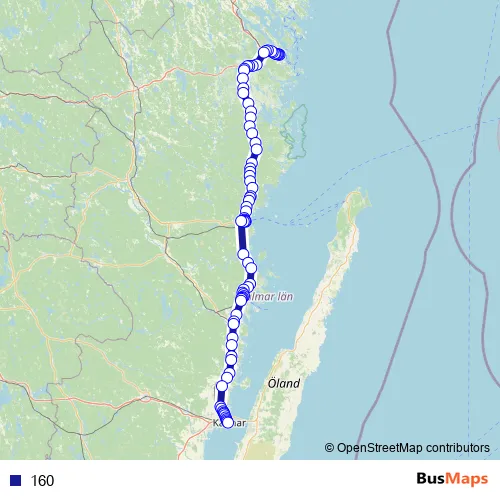 The first stop of the 160 bus route is Västervik station and the last stop is Kalmar Centralstation. 160 is operational during everyday.