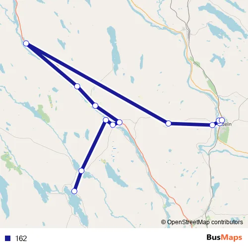 The first stop of the 162 bus route is Vindeln Resecentrum/Station and the last stop is Skivsjö. 162 is operational during on weekdays.