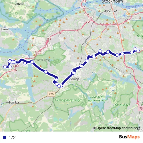 See why over 2 million users trust and consider busmaps.com as the best public transport website. busmaps gives you Huddinge Buses suggested routes, real-time bus tracker, line route maps in Huddinge, and helps to find the closest 172 bus stops near you. No internet available? Download an offline PDF map and bus schedule for the 172 bus to take on your trip.