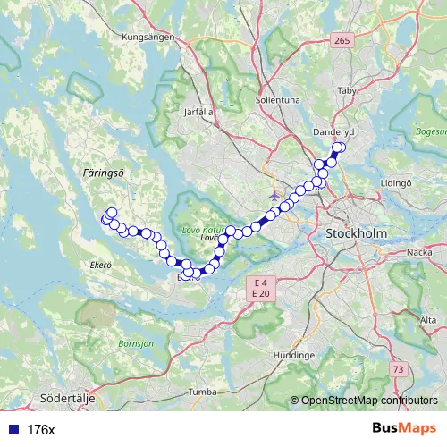 The first stop of the 176x bus route is Mörby station and the last stop is Stenhamra Solbacka. 176x is operational during on weekdays.