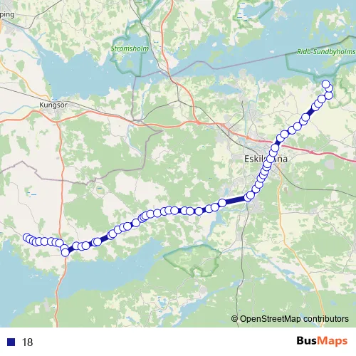 The first stop of the 18 bus route is Rabo Stora Sundby and the last stop is Sundbyholm Eskilstuna. 18 is operational during everyday.