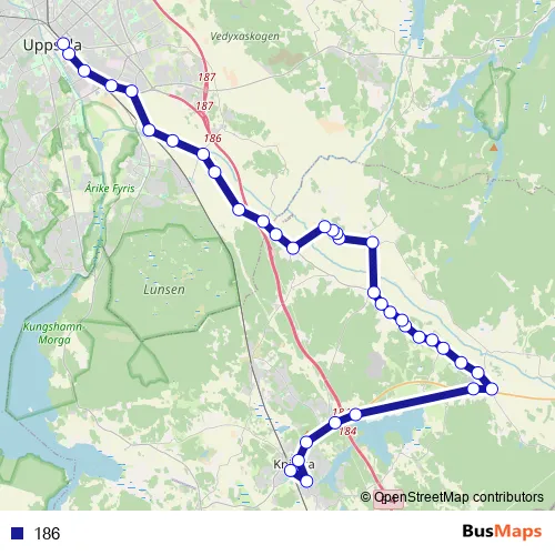The first stop of the 186 bus route is Knivsta station and the last stop is Uppsala Centralstation. 186 is operational during everyday.