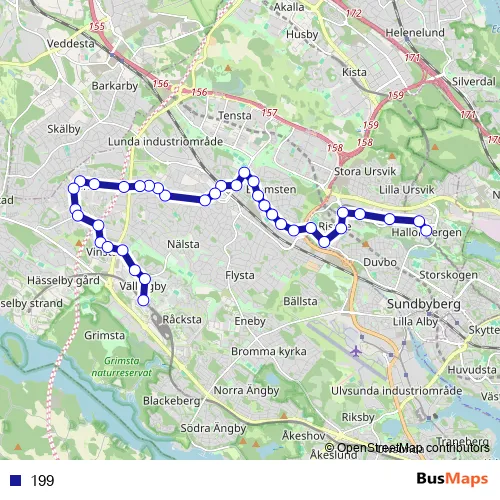 The first stop of the 199 bus route is Hallonbergen T-bana and the last stop is Vällingby T-bana. 199 is operational during on weekends.