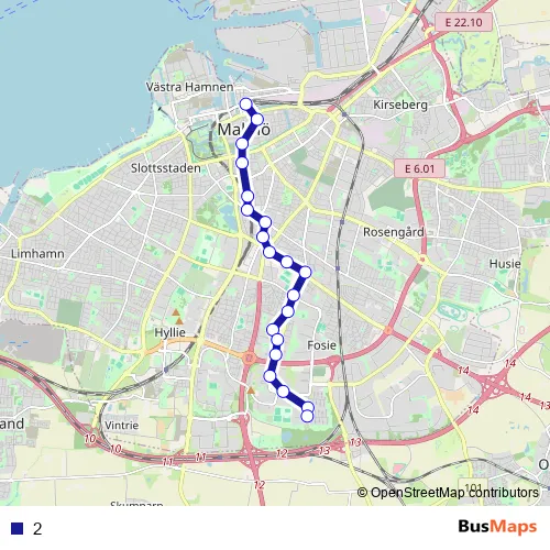 The first stop of the 2 bus route is Malmö Centralstation and the last stop is Malmö Kastanjegården. 2 is operational during everyday.