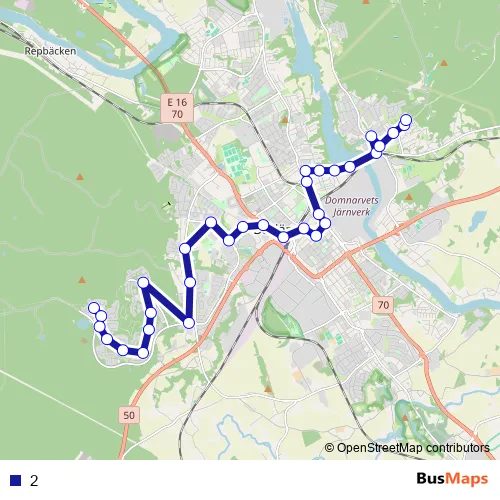 The first stop of the 2 bus route is Lapp Anders väg and the last stop is Bergebyvägen. 2 is operational during everyday.