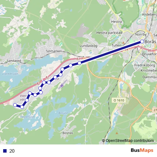 The first stop of the 20 bus route is Borås Centralstation and the last stop is Viared västra. 20 is operational during on weekdays.