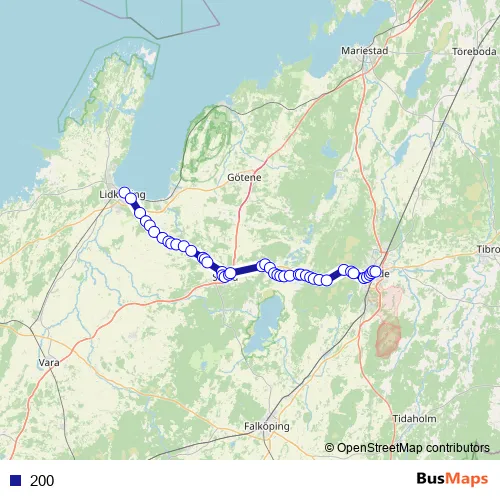 The first stop of the 200 bus route is Lidköping station and the last stop is Skövde Centralstation. 200 is operational during everyday.