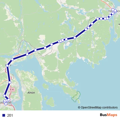 The first stop of the 201 bus route is Sundsvall Centralstation and the last stop is Härnösand station. 201 is operational during on weekdays.