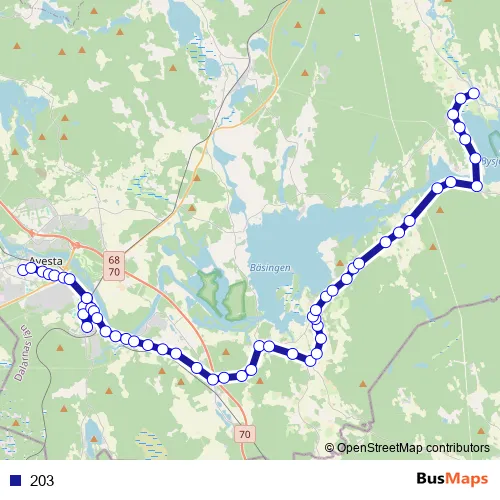 The first stop of the 203 bus route is Avesta busstation and the last stop is By kyrkby skolan. 203 is operational during on weekdays.