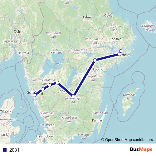 The first stop of the 2031 rail route is Stockholm Centralstation and the last stop is Göteborg Centralstation. 2031 is operational during on weekends.