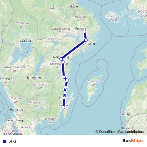 The first stop of the 206 bus route is Arlanda terminal 4 buss and the last stop is Kalmar Centralstation. 206 is operational during everyday.