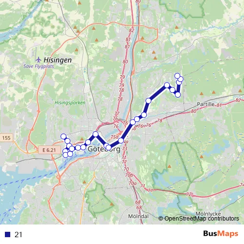 The first stop of the 21 bus route is Göteborg Eketrägatan and the last stop is Merkuriusgatan. 21 is operational during everyday.