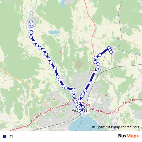 The first stop of the 21 bus route is Skultuna and the last stop is Tillberga. 21 is operational during everyday.