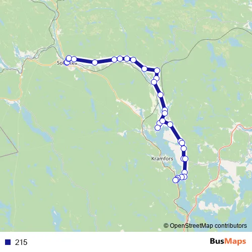 The first stop of the 215 bus route is Sollefteå station and the last stop is Lunde Kramfors. 215 is operational during on weekdays.