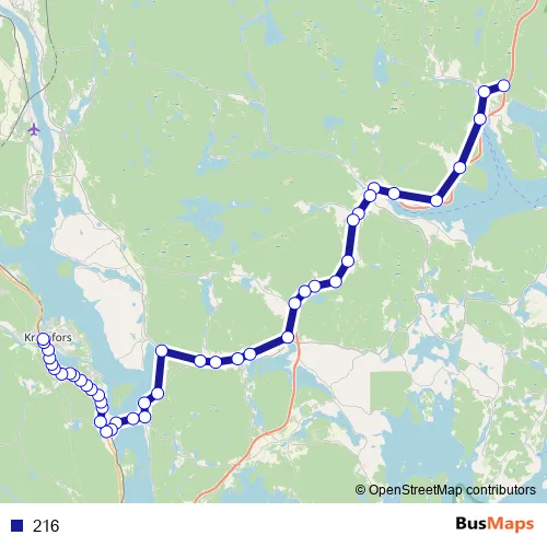 The first stop of the 216 bus route is Docksta busstation and the last stop is Kramfors station. 216 is operational during on weekdays.