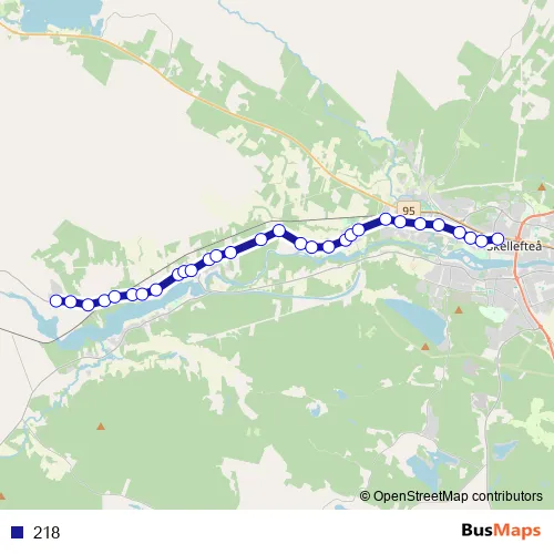 The first stop of the 218 bus route is Hamptjärn Skellefteå and the last stop is Skellefteå busstation. 218 is operational during everyday.