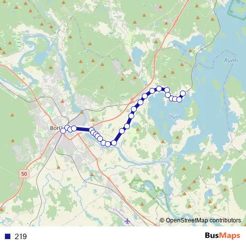 The first stop of the 219 bus route is Borlänge Centralstation and the last stop is Storsund. 219 is operational during on weekdays.
