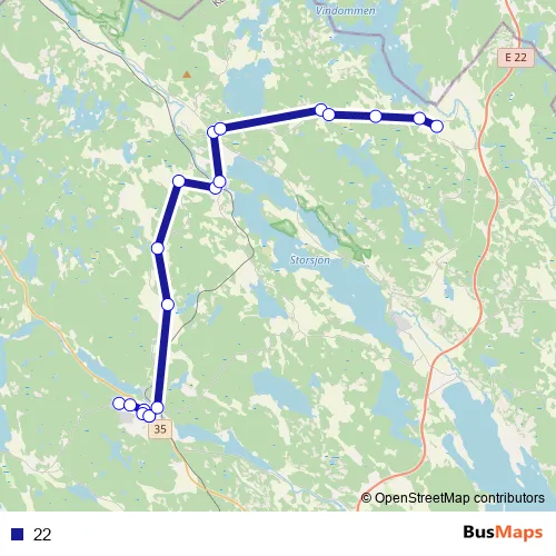 The first stop of the 22 bus route is Överum Pildammsvägen and the last stop is Ukna skola. 22 is operational during on weekdays.