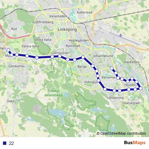 The first stop of the 22 bus route is Ekhaga and the last stop is Linköping Mjärdevi. 22 is operational during on weekdays.