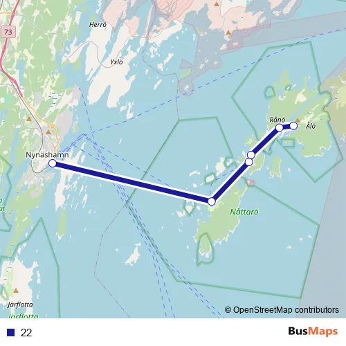 The first stop of the 22 ferry route is Ålö brygga and the last stop is Nynäshamn station. 22 is operational during on weekends.
