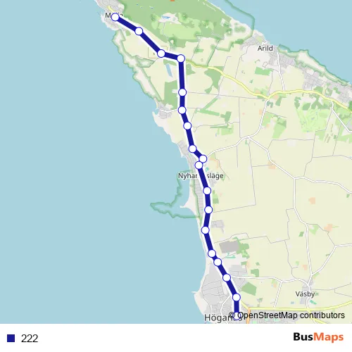 The first stop of the 222 bus route is Mölle busstation and the last stop is Höganäs Busstorget. 222 is operational during everyday.