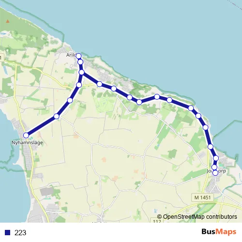 The first stop of the 223 bus route is Nyhamnsläge Centrum and the last stop is Jonstorp centrum. 223 is operational during everyday.
