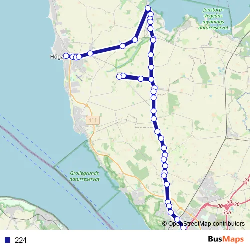 The first stop of the 224 bus route is Höganäs Busstorget and the last stop is Helsingborg Djursjukhuset. 224 is operational during on weekdays.