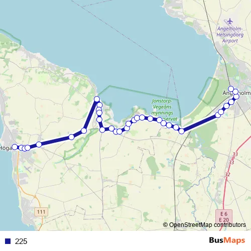 The first stop of the 225 bus route is Höganäs Busstorget and the last stop is Ängelholm station. 225 is operational during everyday.