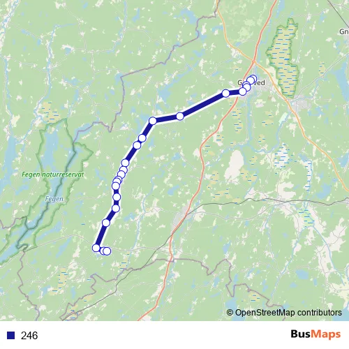 The first stop of the 246 bus route is Gislaved busstation and the last stop is Broaryd centrum. 246 is operational during on weekdays.