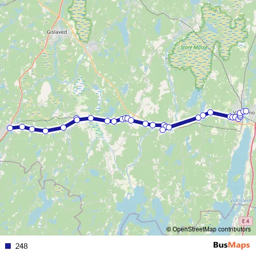 The first stop of the 248 bus route is Smålandsstenar station and the last stop is Värnamo Finnvedens Gymnasium. 248 is operational during on weekdays.