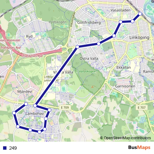 The first stop of the 249 bus route is Bygärdesgatan and the last stop is Linköping Centralstation. 249 is operational during on weekdays.