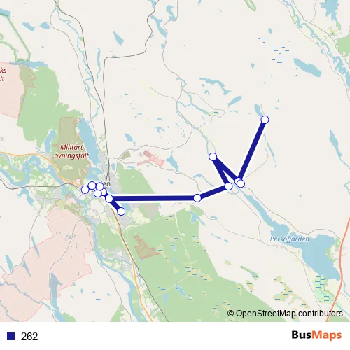 The first stop of the 262 bus route is Gemträsk 52 and the last stop is Boden Campus. 262 is operational during on weekdays.