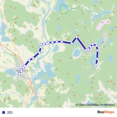 The first stop of the 263 bus route is Garpenberg Herrgården and the last stop is Hedemora station. 263 is operational during everyday.