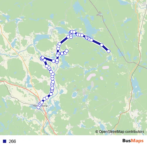 The first stop of the 266 bus route is Hedemora station and the last stop is Nordbäcksbo. 266 is operational during on weekdays.