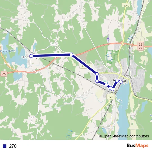 The first stop of the 270 bus route is Hjortsberga and the last stop is Alvesta station. 270 is operational during on weekdays.