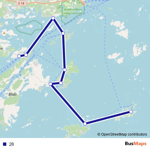 The first stop of the 28 ferry route is Söderöra brygga and the last stop is Furusund brygga. 28 is operational during everyday.