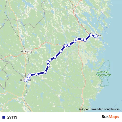 The first stop of the 29113 rail route is Hultsfred station and the last stop is Västervik station. 29113 is operational during everyday.