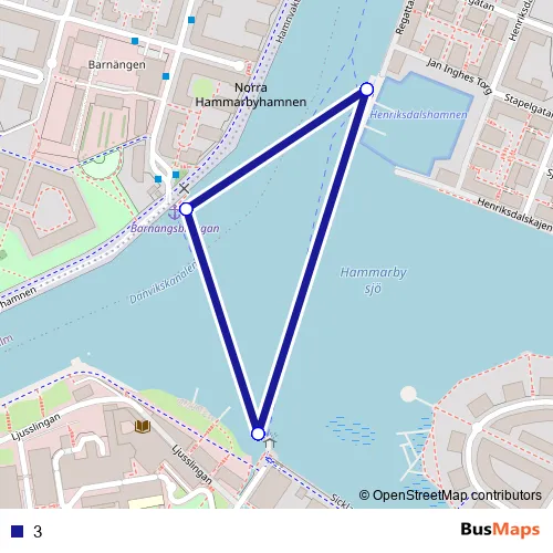The first stop of the 3 ferry route is Barnängen Brygga and the last stop is Barnängen Brygga. 3 is operational during on weekdays.