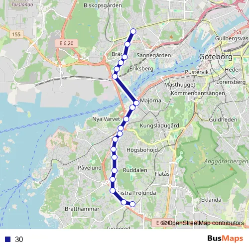 The first stop of the 30 bus route is Göteborg Eketrägatan and the last stop is Frölunda torg. 30 is operational during everyday.