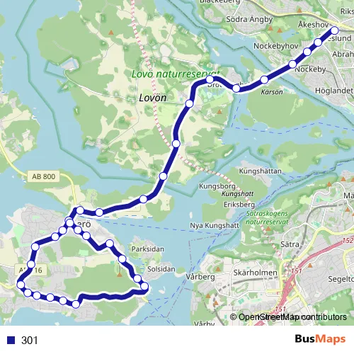 The first stop of the 301 bus route is Brommaplan and the last stop is Ekerö centrum. 301 is operational during everyday.