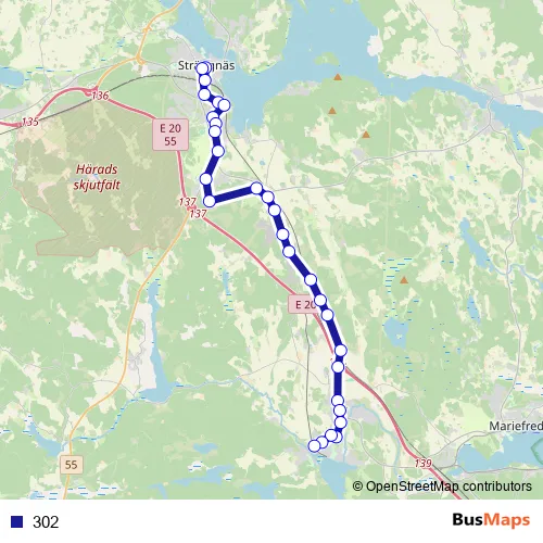 The first stop of the 302 bus route is Strängnäs station and the last stop is Åkers styckebruk. 302 is operational during on weekdays.