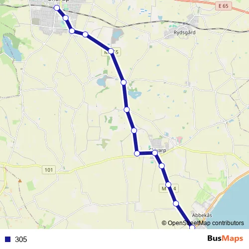 The first stop of the 305 bus route is Skurup station and the last stop is Abbekås. 305 is operational during everyday.
