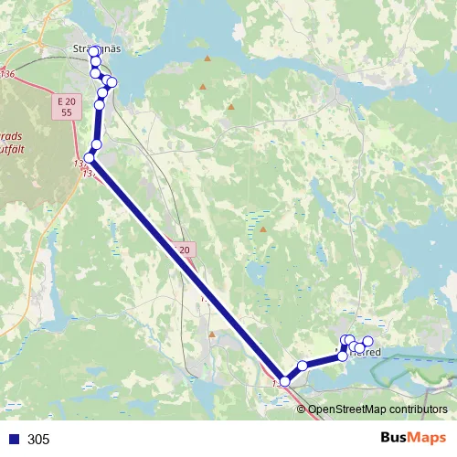 The first stop of the 305 bus route is Strängnäs station and the last stop is Mariefred busstation. 305 is operational during everyday.