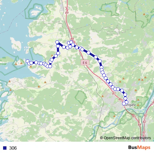 The first stop of the 306 bus route is Rörtången bryggan and the last stop is Kungälv resecentrum. 306 is operational during on weekdays.