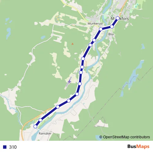 The first stop of the 310 bus route is Munkfors busstation and the last stop is Rudtorpsbron, Ransäter. 310 is operational during everyday.