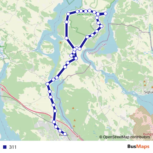The first stop of the 311 bus route is Bålsta station and the last stop is Bålsta station. 311 is operational during everyday.