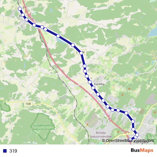 The first stop of the 319 bus route is Kungälv resecentrum and the last stop is Bräcke. 319 is operational during everyday.