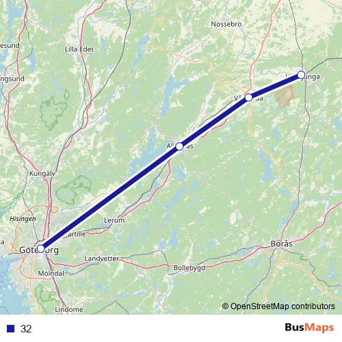 The first stop of the 32 bus route is Alingsås station and the last stop is Göteborg Åkareplatsen. 32 is operational during everyday.