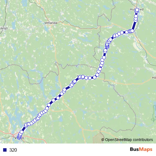 The first stop of the 320 bus route is Växjö station and the last stop is Hultsfred station. 320 is operational during everyday.